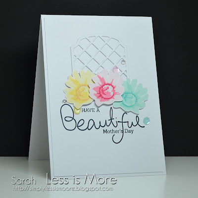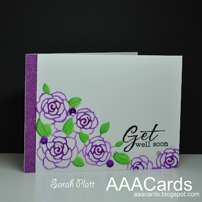I started out by blending a range of Distress inks from yellow tones through to red on a piece of watercolour card. I can't resist a little flicking and spritzing of water with perfect pearls! Followed by some heat embossing of one of the blooms from 'Especially For You' the sentiment is also heat embossed and from the Fun Birthday Sentiments set. A strip of design paper and some gems to my flower centres finishes my card.