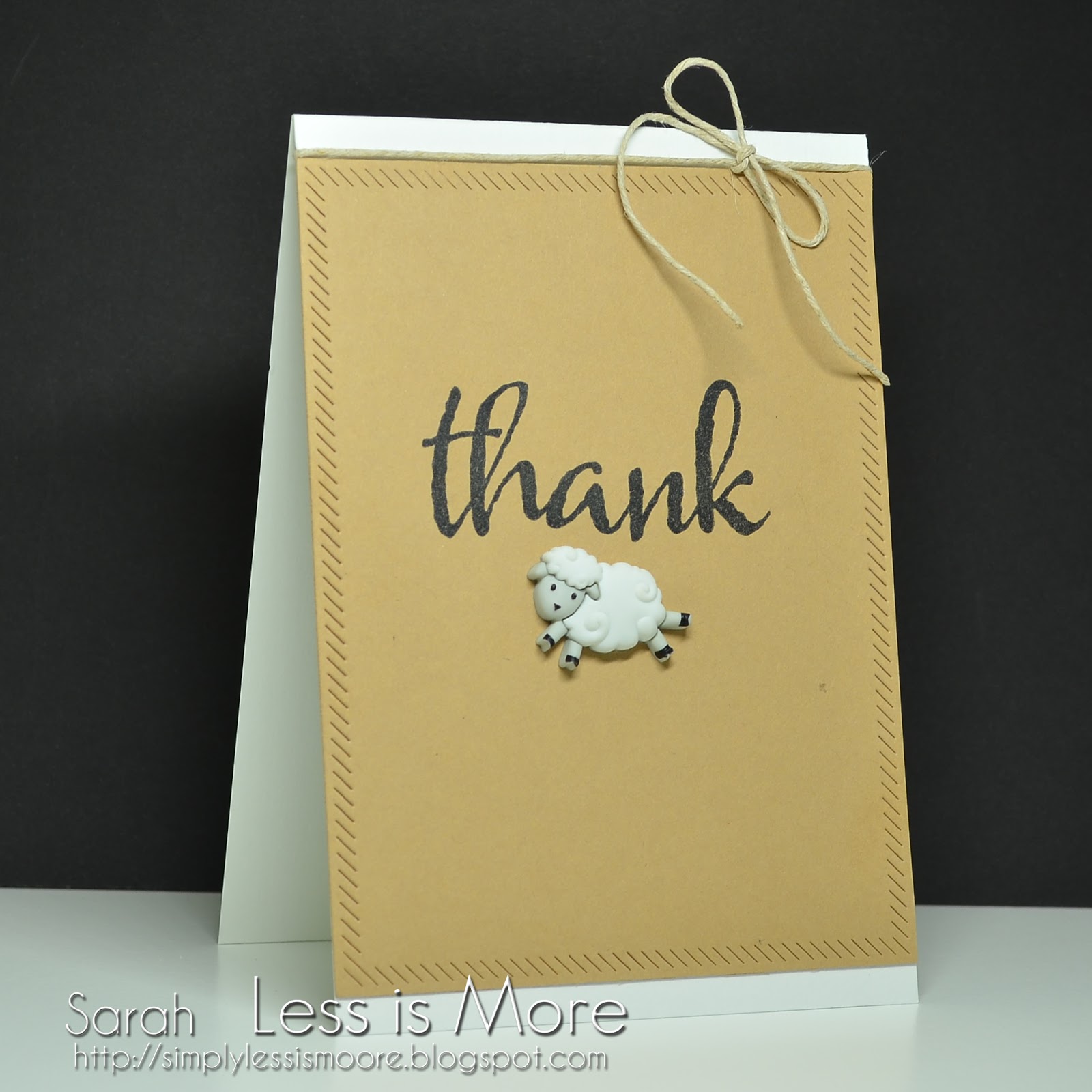 So simple with this one and I never even knew I possessed a 'Sheep' shaped button until I went searching through that 'Must Keep for a Rainy Day' box. I cut the loop off the back that you'd sew through and added a 'thank' sentiment from Winnie & Walter (another destash item from the lovely Michelle). The kraft panel was die-cut with an inside out diagonal stitched rectangle die from MFT Die-Namics and to finish a little piece of hemp cord.