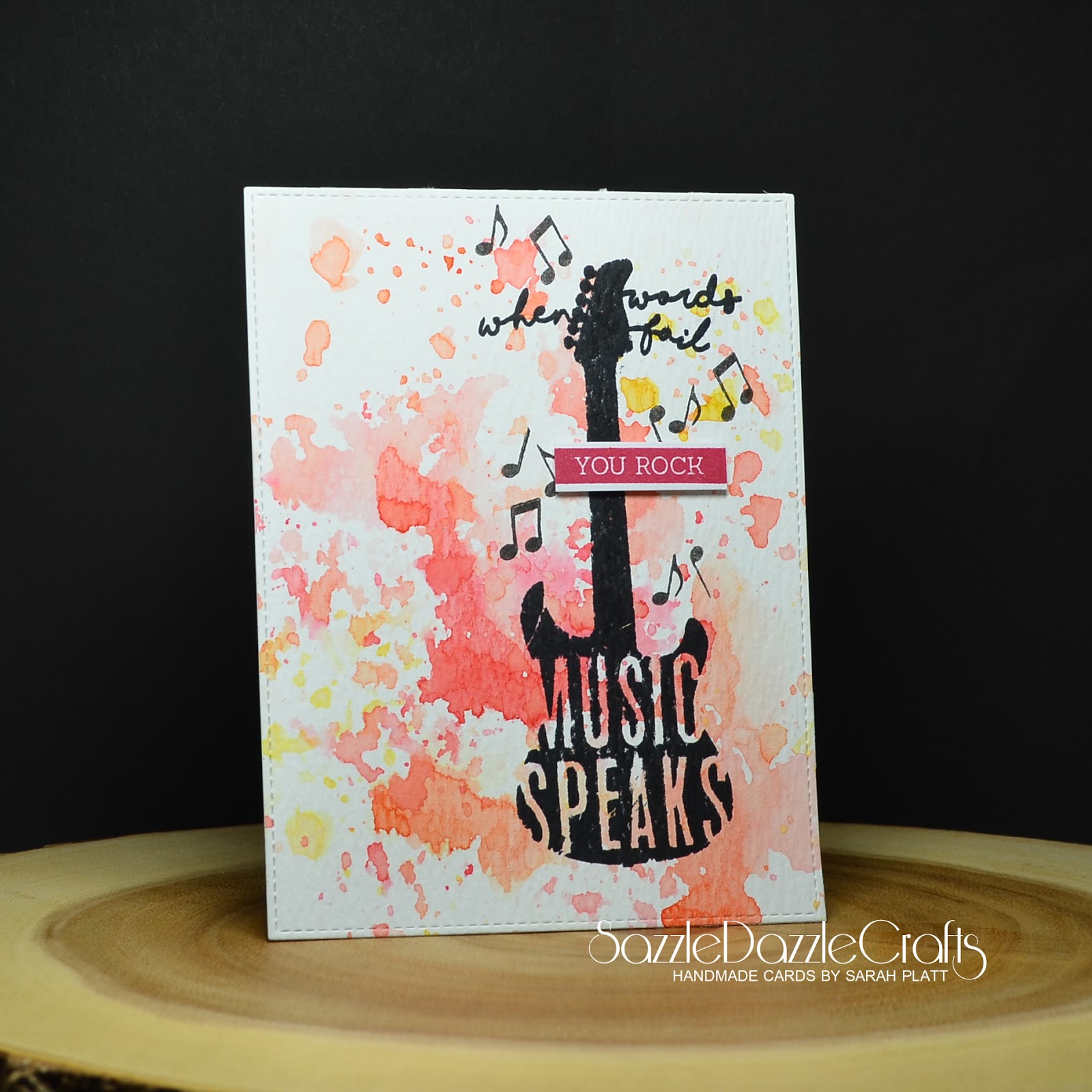 Both cards use the 'Music Speaks' set by Visible Image with a 'You Rock' sentiment and musical notes from Uniko. The background on the first card is created by 'smooshing' Distress Inks, whereas the second one is a Brusho based creation!